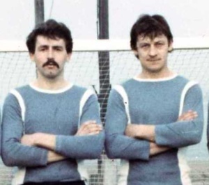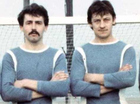 Na tym archiwalnym zdjęciu: Oktaba Zbigniew (z lewej) i śp. Fluks Jan – strzelcy bramek w meczu z 5.11.1977