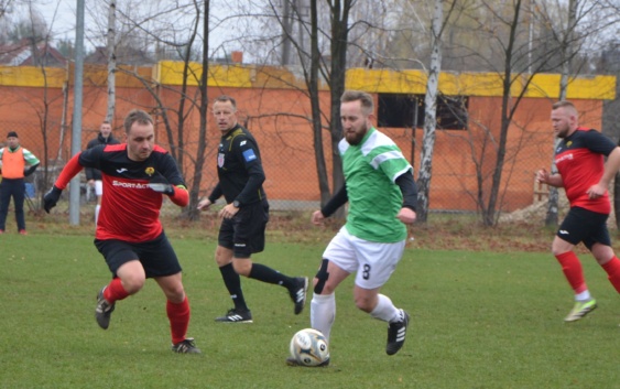 Na zdjęciu: Krzysztof Karwowski (przy piłce) w meczu z Liderem wykorzystał zagapienie się ich golkipera i w 43’ strzelił kontaktowego gola